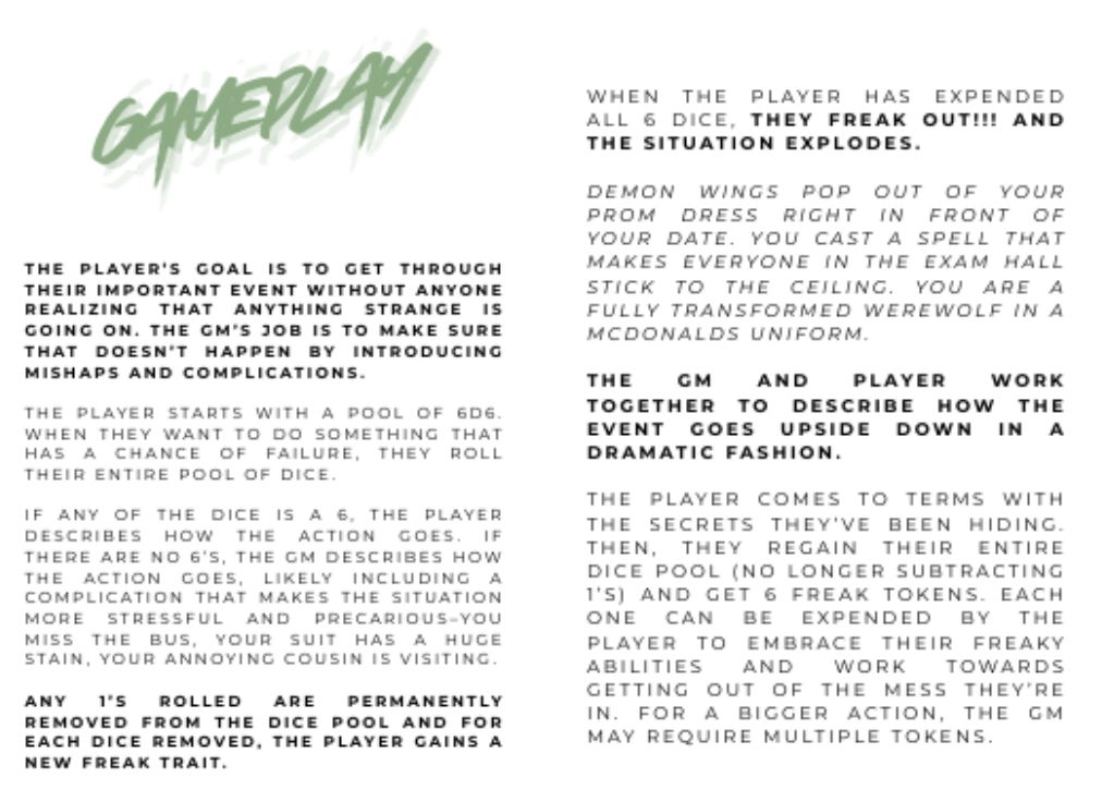 Freak Out is a one-page RPG for one GM and one Player. The Player is a high schooler who isn’t quite comfortable in their own skin and is about to get a LOT MORE uncomfortable because of some strange changes at the worst possible time! It’s about desperately trying to keep an embarrassing part of yourself locked up and failing in spectacular fashion. Become a were-creature, alien, changeling, or any other kind of freakish creature you can think of and get ready to FREAK OUT!!!